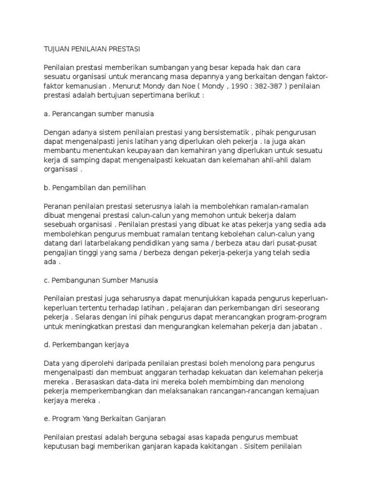 Penilaian prestasi memberikan sumbangan yang besar kepada hak dan cara sesuatu organisasi untuk merancang masa depannya yang berkaitan dengan faktorfaktor kemanusian. Tujuan dan Manfaat Penilaian Prestasi Kerja Penilaian terhadap karyawan merupakan sebuah proses formal untuk melakukan peninjauan kembali dan evaluasi prestasi kerja seseorang secara periodik. Pelaksanaan penilaian sistem penilaian prestasi kerja prestasi kerja karyawan karyawan harus tetap diadakan dan sebaiknya dilakukan secara dilaksanakan dalam sebuah terbuka.